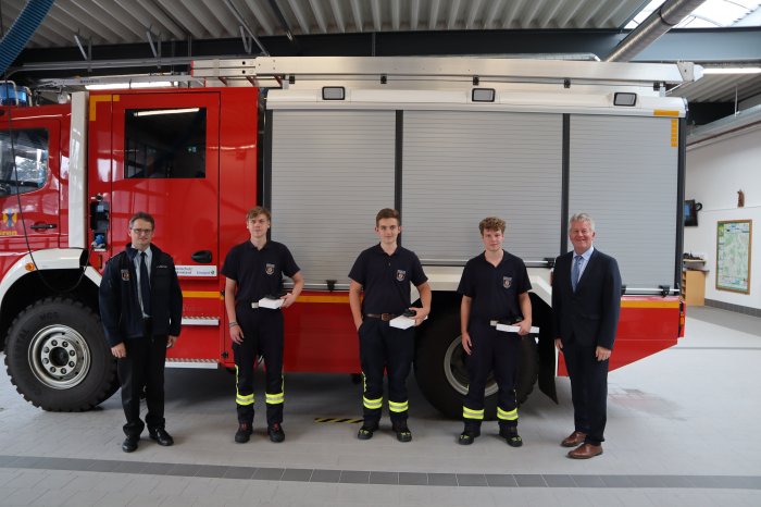 Aus Emsbüren bestanden den Lehrgang erfolgreich Josias Timmel, Dominik Lüken und Jan Egbers (ab 2. v. l. n. r.). Gemeindebrandmeister Marco Lögering (links) und Bürgermeister Bernhard Overberg (rechts) gratulierten ihnen zum Bestehen und übergaben feierlich die digitalen Meldeempfänger.