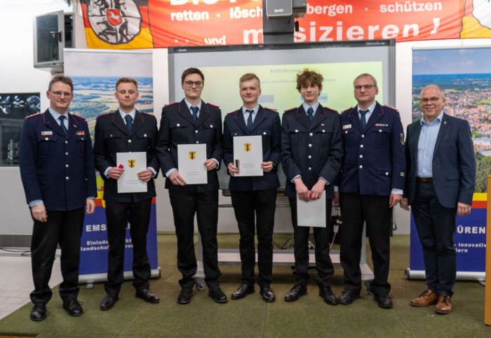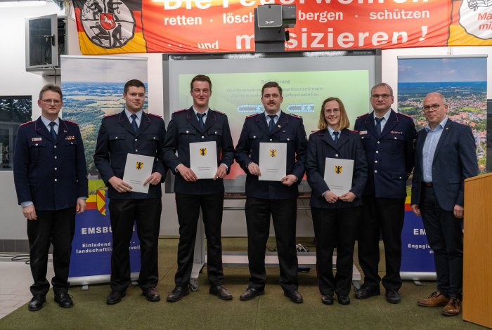 In die Einsatzabteilung: Tristan Voss, Marcel Umnuß, Luc Fangmeyer, Maximilian Kley In dem Musikzug: Hugo Hölscher, Johannes Hulsmeier, Lea-Marie Gebbe |