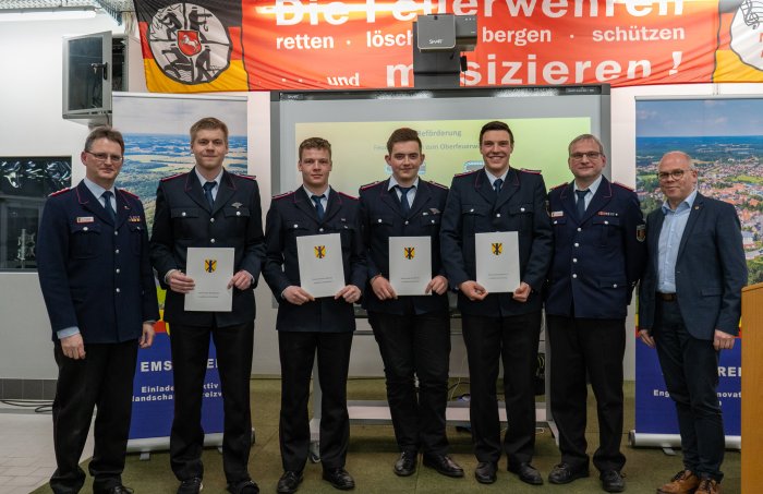 Zum Oberfeuerwehrmann: v. l. n. r.: Josias Timmel, Jan Egbers, Dominik Lüken, Kevin Ballmann, Pascal Gausmann (fehlend) |