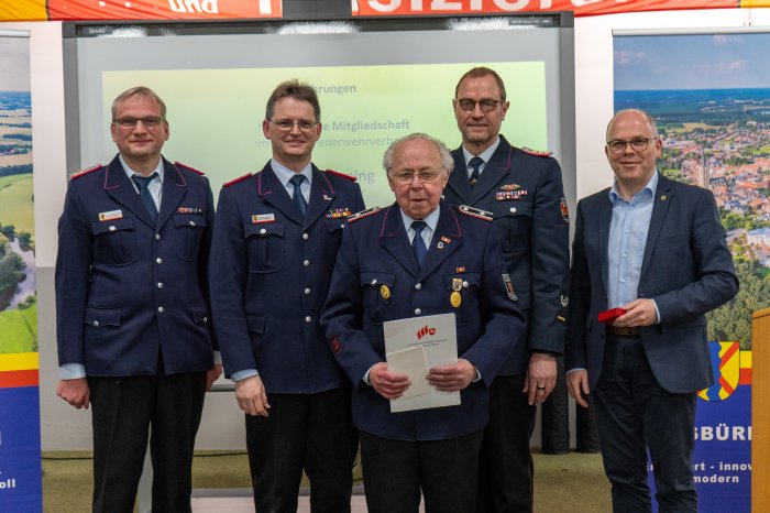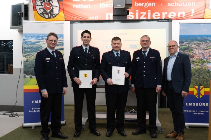 Trotz der hohen Anforderungen besuchten die Einsatzkräfte im Jahr 2023 insgesamt 33 Lehrgänge zur Aus- und Fortbildung. Diese Zahlen verdeutlichen die signifikante Bedeutung des ehrenamtlichen Engagements in Emsbüren. Im Mittelpunkt der Jahresdienstversammlung standen wieder zahlreiche Neuaufnahmen, Wahlen, Beförderungen und Ehrungen. So wurden unter anderem als neue stellvertretende Zugführer Thomas Räkers zum stv. ZF des 1. Zuges und Florian Schulte zum stv. ZF des 2. Zuges für die nächsten drei Jahre ernannt. Weiterhin wurde Tobias Küpers als neuer stv. Gruppenführer der Gruppe 3 ernannt. Um auch stark in der Jugendarbeit vertreten zu sein, übernahm Julian Scheffer das Amt des stv. Gemeindejugendfeuerwehrwartes von seinem Amtsvorgänger Florian Schulte, welcher das Amt nach 9 Jahren aufgrund seiner neuen Funktionen übergibt. Katharina Krüssel ist zudem als stv. Kinderfeuerwehrwartin ernannt worden und übernimmt das Amt von Michael Egbring, welcher als Gründungsmitglied der KF das Amt nach 13 Jahren übergibt. Als dienstältestes Mitglied der Freiwilligen Feuerwehr Emsbüren in der Alters- und Ehrenabteilung erhielt Paul Arning eine besondere Ehrung zu 75 Jahren Mitgliedschaft.