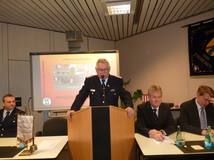 In seinem Jahresbericht lies Kley das vergangene Jahr Revue passieren und blickte auf insgesamt 100 Einsätze zurück, die die 75 Einsatzkräfte der Feuerwehr bewältigten. Zudem fielen knapp 3.000 Stunden für Aus- und Fortbildung an. Leider waren bei den 100 Einsätzen auch wieder Tote und Schwerverletzte zu beklagen, so Kley. All diese Einsätze seien eine starke Belastung für die Kameradinnen und Kameraden. Deshalb dankte er ausdrücklich der Notfallseelsorge und nannte namentlich Marcus Droste und Marco Lögering. Besonders hob Kley die vier Großbrände hervor. Am Neujahrstag stand in Gleesen ein Schuppen in Vollbrand, im April brannte eine Werkstatthalle in voller Ausdehung, einen Brand im Hackschnitzelkraftwerk der Firma Emsflower konnte die Feuerwehr rasch löschen. Bei einem Großbrand im Lingener Stadtteil Holthausen-Biene leistete die Emsbürener Feuerwehr eine nachbarschaftliche Löschhilfe. Bei den Hilfeleistungen sind besonders das Unwetter im Januar mit 8 Einsätzen an einem Tag, ein schwerer Verkehrsunfall auf der L58 mit einem Toten sowie der Bahnunfall mit ebenfalls einem Toten hervorzuheben. An zahlreichen Veranstaltungen, wie z. B. dem Herzogsmarkt oder dem Rauchmelderaktionstag, nahmen Kameraden teil. Sowohl auf Kreisebene als auch an der Akademie für Brand- und Katastrophenschutz konnten wieder zahlreiche Lehrgänge zur Aus- und Weiterbildung besucht werden. Auch personell hat sich im vergangenen Jahr etwas getan; aus beruflichen Gründen traten Simone Fangmeyer, Jana Paschert und Agnes Bensch aus der Wehr aus. Er wünschte den Dreien für ihren weiteren Lebensweg alles Gute. Abschließend dankte Kley Kommando, Rat und Verwaltung für die gute Zusammenarbeit im vergangenen Jahr.