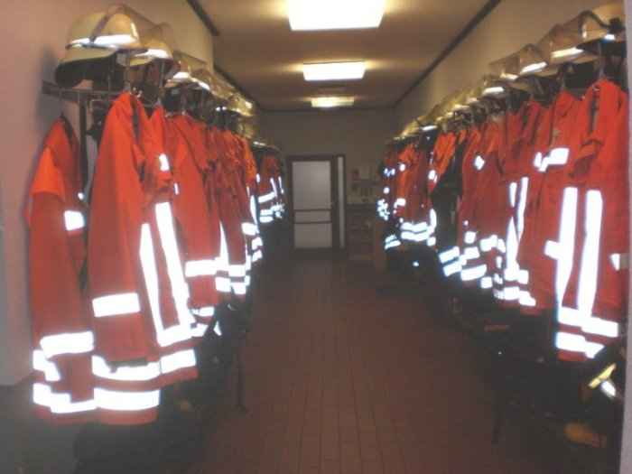 Im Flur des Hauptgebäudes befinden sich die Haken mit den Einsatzklamotten. |